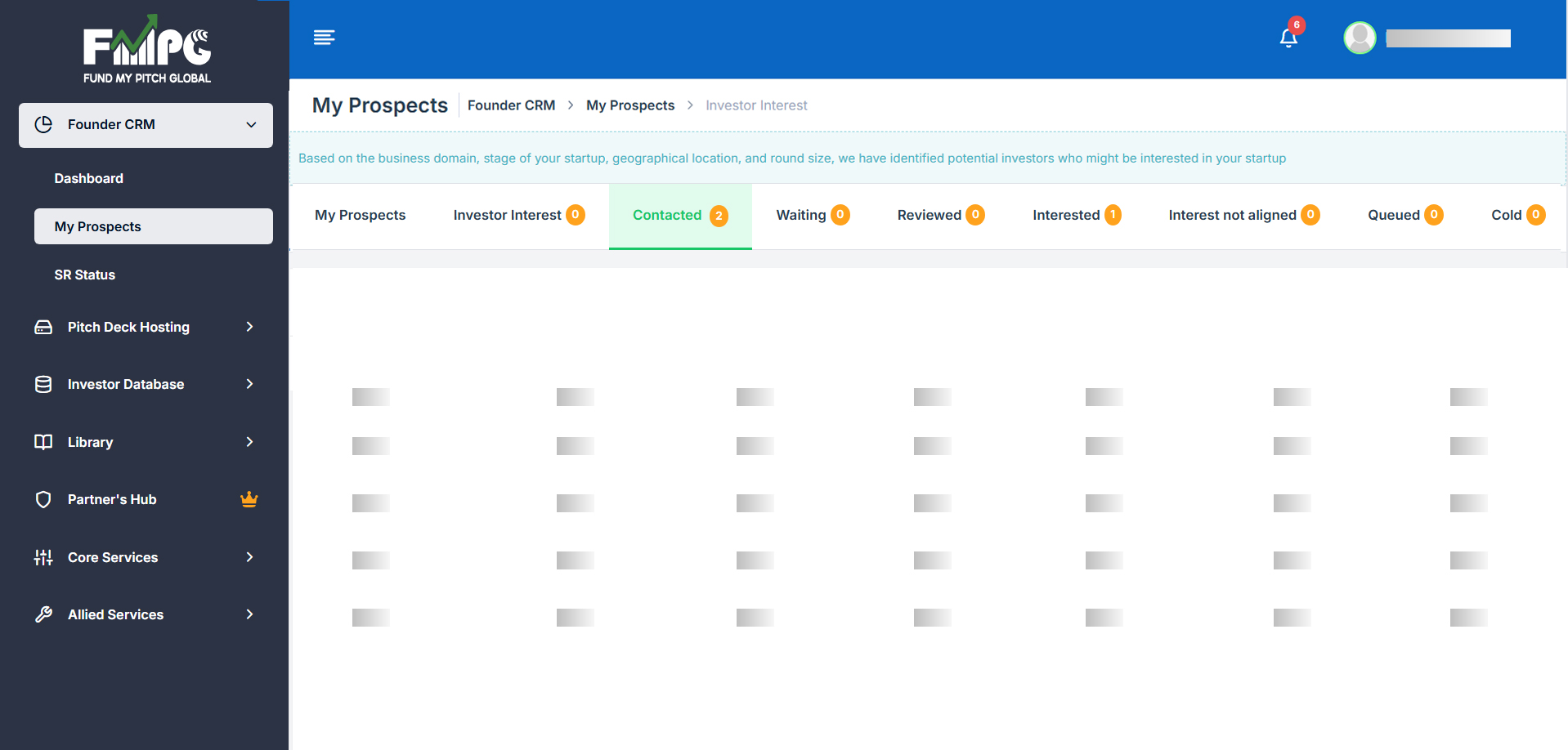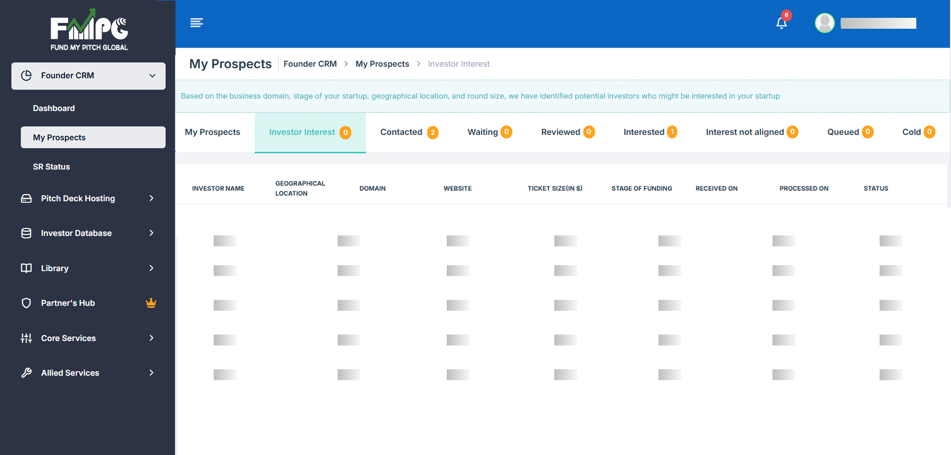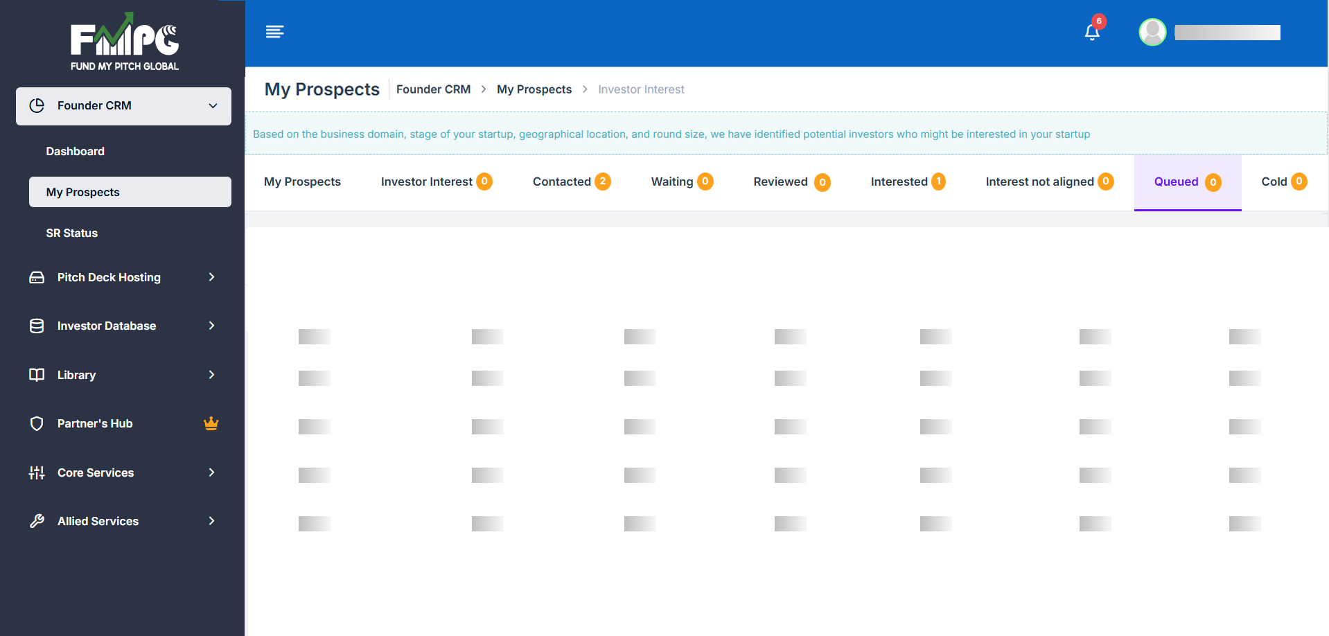 The second section shows the status of your Prospects. Prospects are Investors that are mapped by our software based on 4 key criteria (such as Investment Domain, Investment stage, Geographical location and ticket size). It also provides a Queue section where, filtered prospects which are yet to be sent will be shown. As every investor had limited the number of Pitches which they would like to review during every week, If an investor is already loaded with maximum proposals, your proposal will be queued.