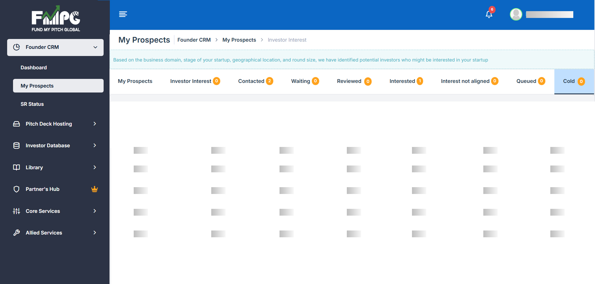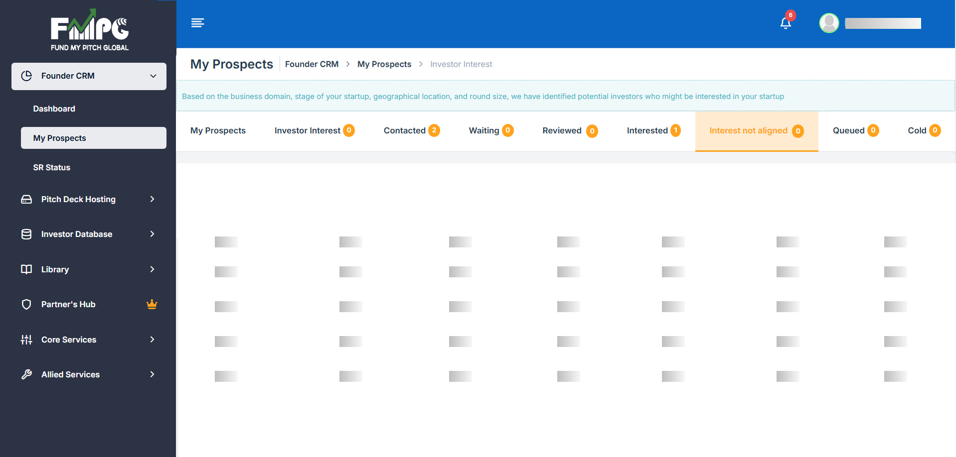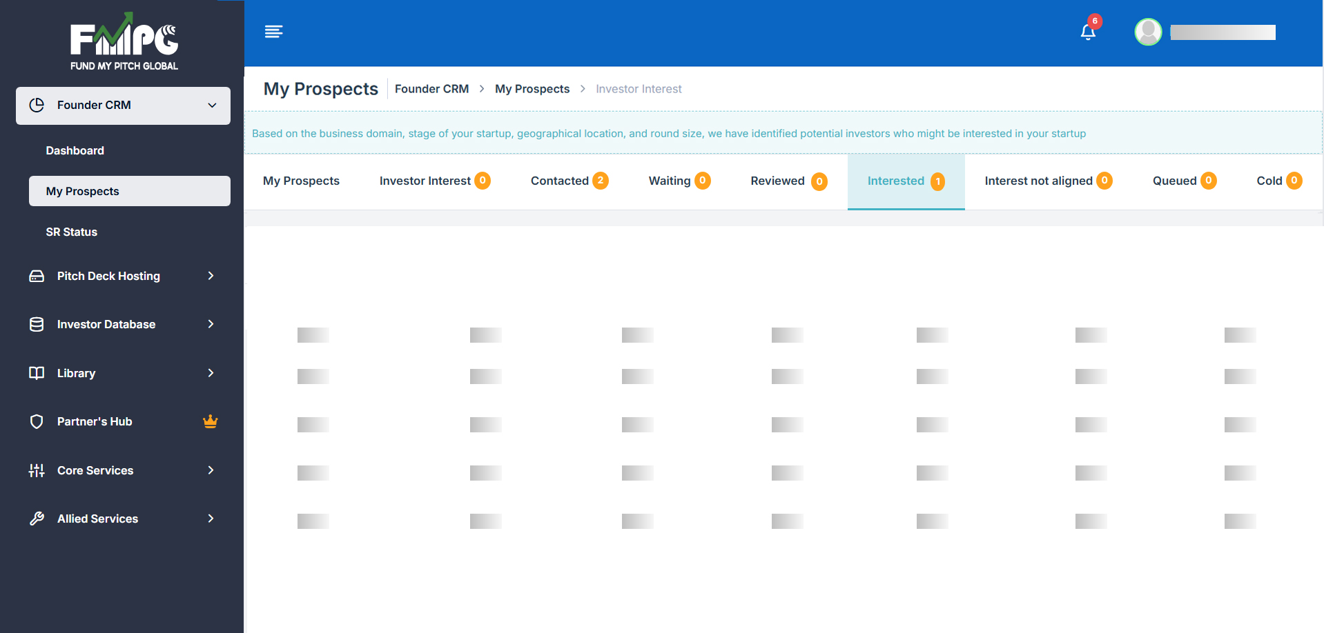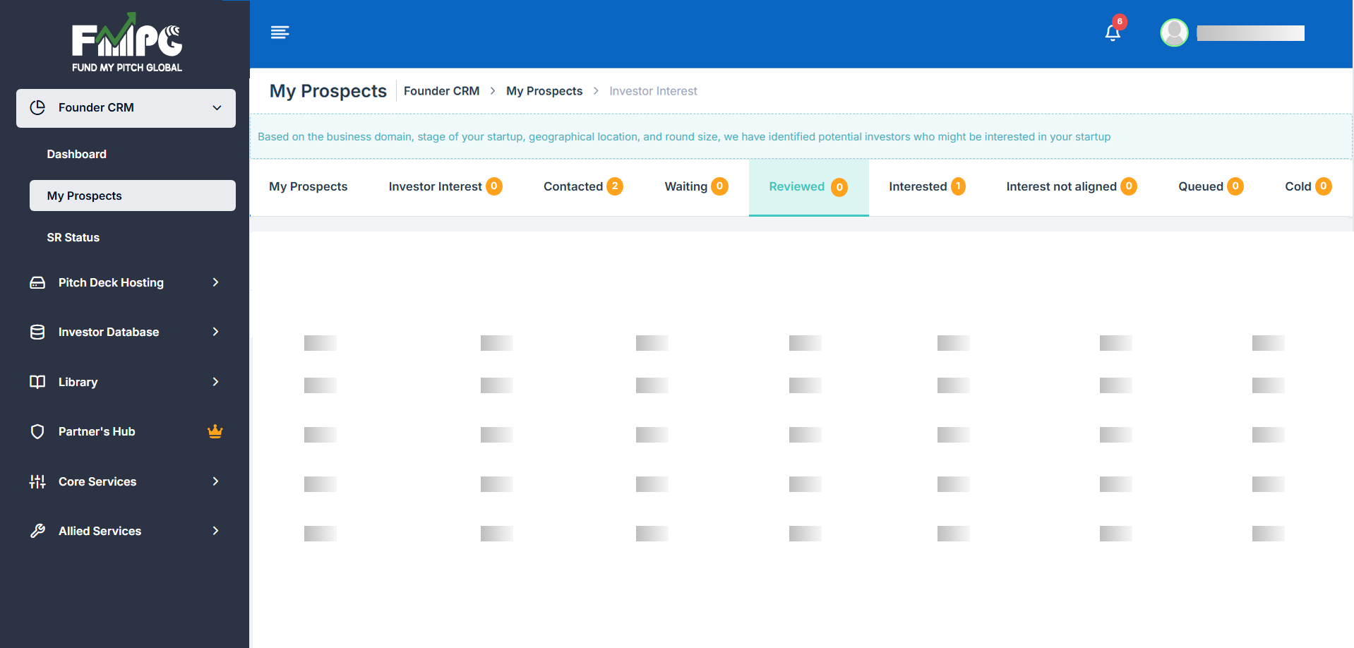 The second section shows the status of your Prospects. Prospects are Investors that are mapped by our software based on 4 key criteria (such as Investment Domain, Investment stage, Geographical location and ticket size). It also provides a Queue section where, filtered prospects which are yet to be sent will be shown. As every investor had limited the number of Pitches which they would like to review during every week, If an investor is already loaded with maximum proposals, your proposal will be queued.