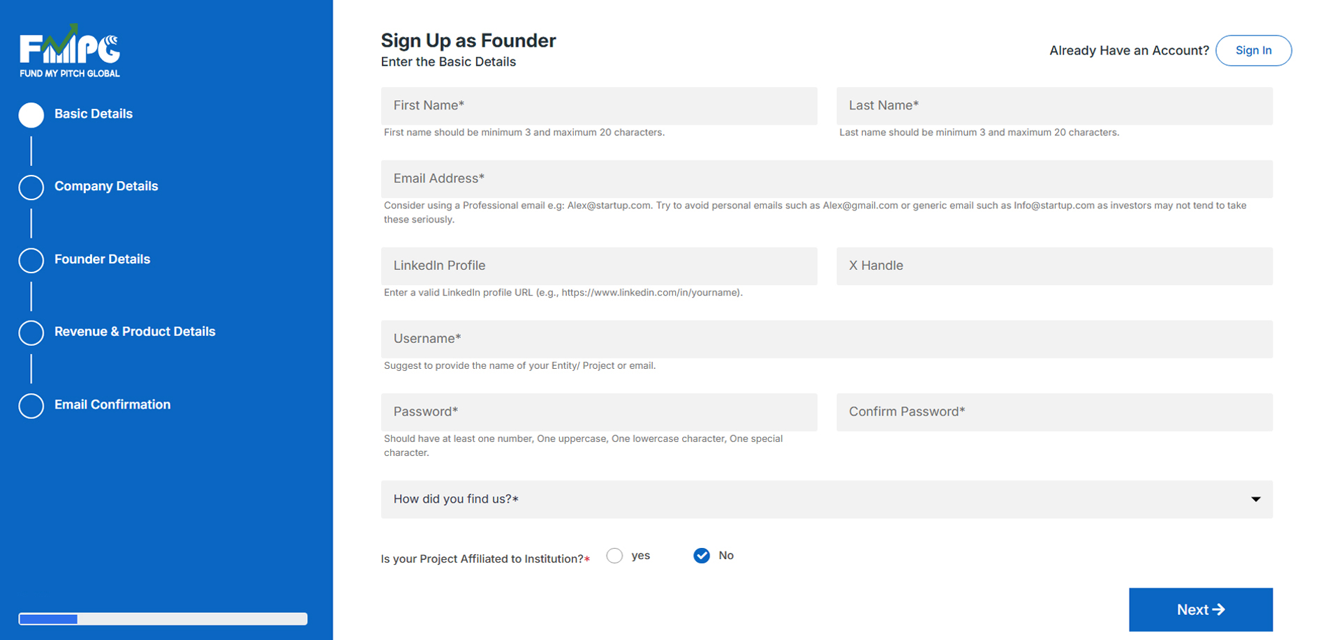 For Founders from Institutions (such as Universities and Colleges), we have added a dedicated section where details regarding your sponsoring Professor and recommendation letter from the University is requested. This is very important for students. On a daily basis, hundreds of proposals pass through investors desk. Without proper reference, it is highly unlikely any Investor would consider your proposal. Hence, in the absence of a strong LinkedIn network and referrals, it is imperative to have a strong referral from your Institution and Professors. This feature can also be used by the Alumnis of an Institution.